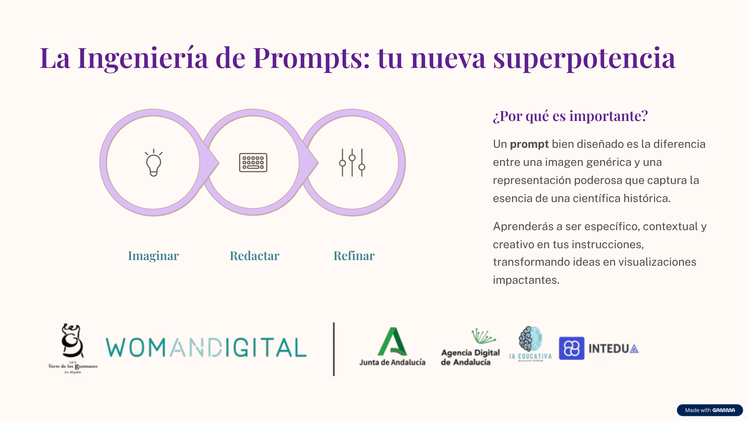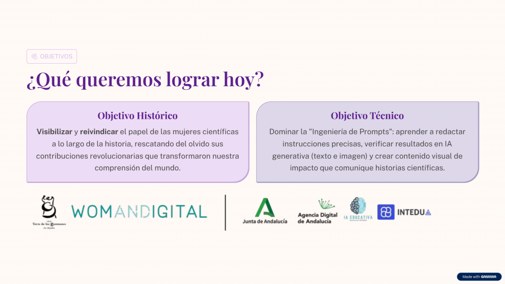 El objetivo de esta actividad era doble, por un lado dotar de unos conocimientos básicos sobre el «buen uso» de la IA, por otro hacer un más que merecido reconocimiento histórico a estas mujeres científicas que consiguieron logros increibles.