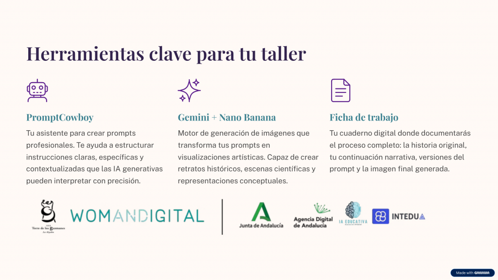 Usamos aplicaciones interesantes como: PromptCowboy, Gemini o Nano Banana dónde usamos nuestra creatividad para «dirigir» la creación con IA de una historia alternativa de mujeres científicas de la talla de Ada Lovelace, Hedy Lamarr, Rosalind Franklin, Margaret Hamilton, Katherine Johnson y Katie Bouman.