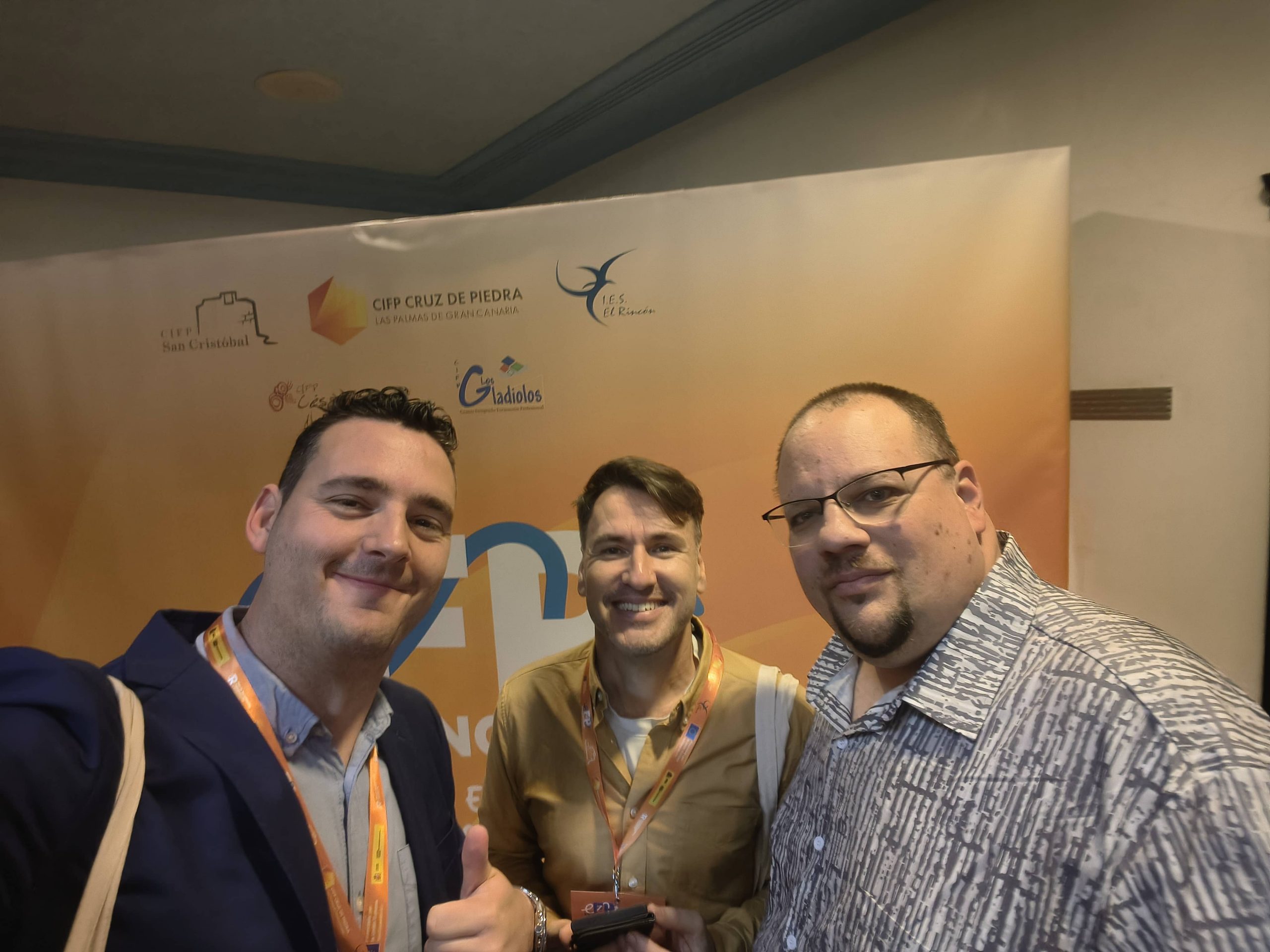 Tras el evento, tuve la fortuna de almorzar con varios compañeros y compañeras de los centros indicados anteriormente y en especial me gustaría destacar la labor realizadas por Aniria Tirma Díaz Cruz, directora del CIFP Los Gladiolos (Santa Cruz de Tenerife) y de Alejandro García del I.E.S. El Rincón (Las Palmas de Gran Canaria).