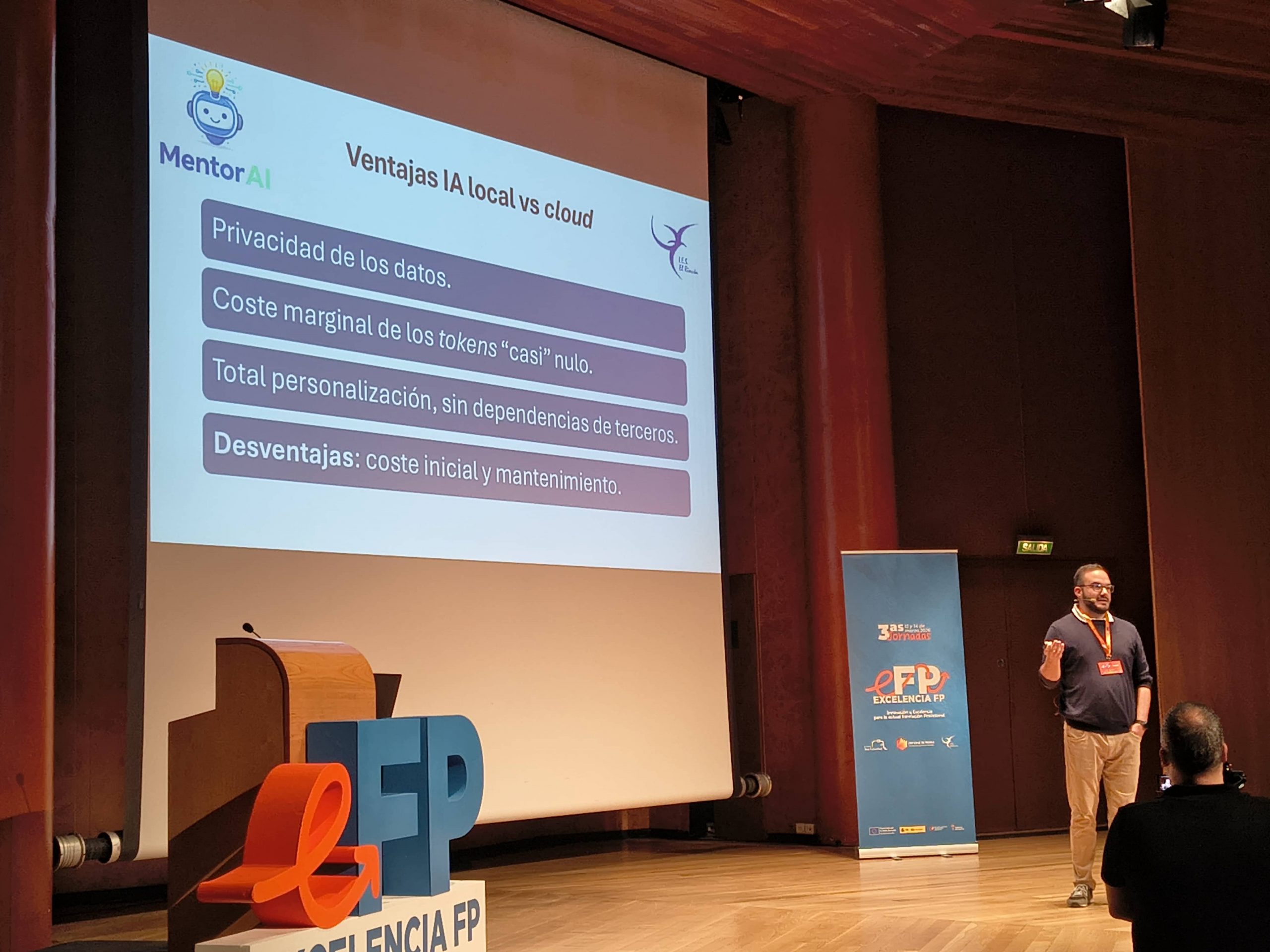 A continuación intervinieron Alberto Alemán y Tiburcio Cruz del IES El Rincón dónde presentaron su proyecto Escritorios Virtuales con Isard seguido de Jose Francisco Lorenzo (os sonará del día anterior) con su proyecto MentorAI: gestor de asistentes de aprendizaje personalizados para el alumnado,  los cuales les veo unas posibilidades exponenciales y ya estamos sopesando participar de forma activa en el mismo desde la Asociación INTEDUA (IAEducativa) y mi propio centro docente.