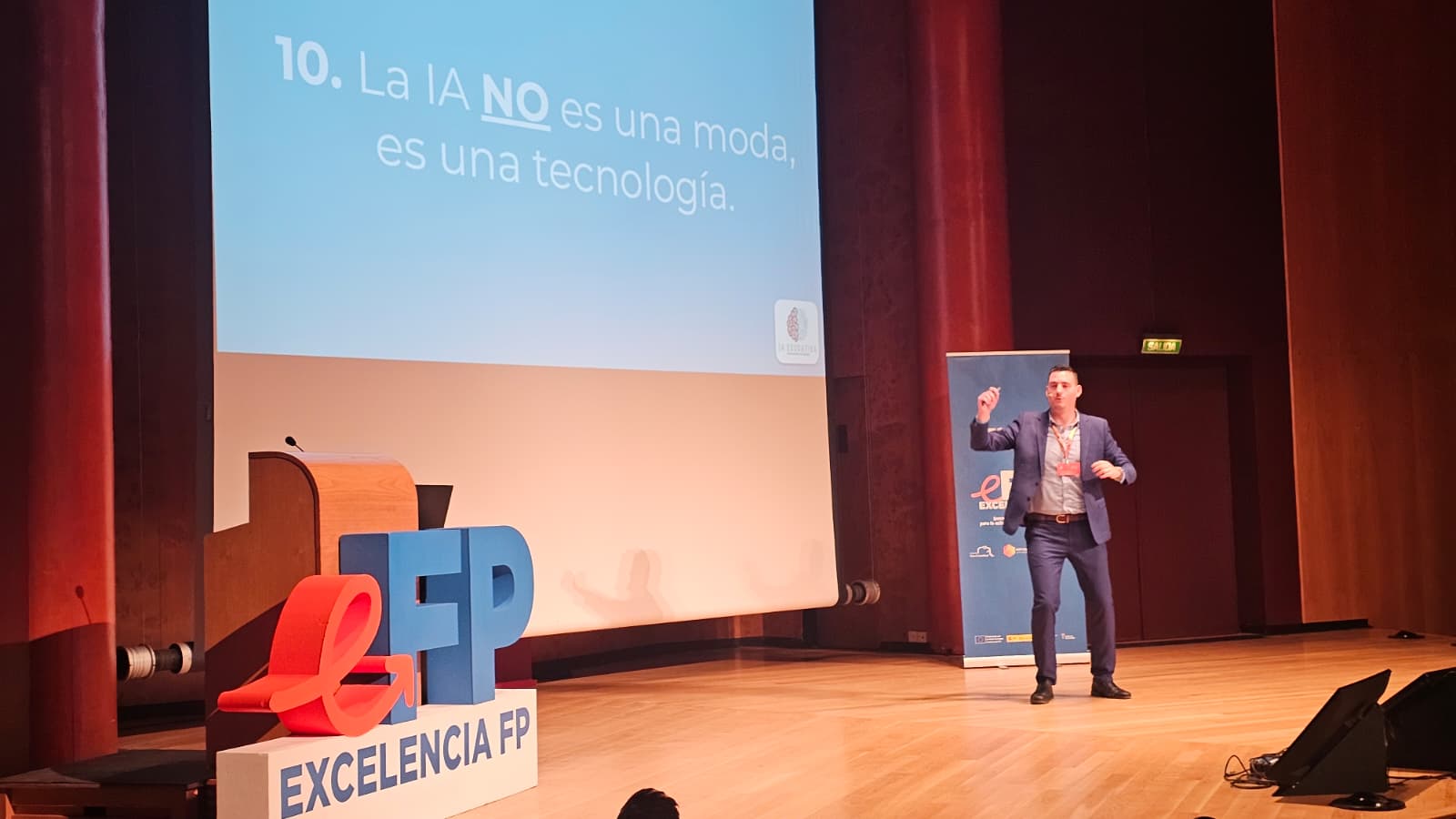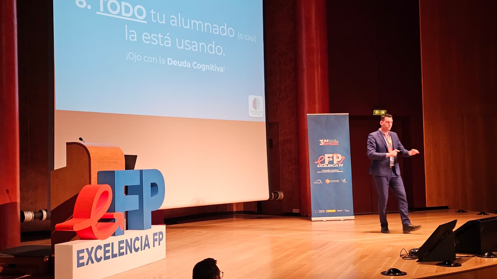 La penultima intervención, que no pude disfrutar en directo porque tuve que prepararme para el cierre fue del compañero Eduardo Manuel Martínez del CIFP Los Gladiolos titulada Formación Adaptativa: Aprendizaje Individualizado mediado por IA.